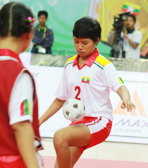 Nữ Myanmar trong trang phục áo trắng quần đỏ biểu diễn trong trận chung kết gặp Thái Lan.