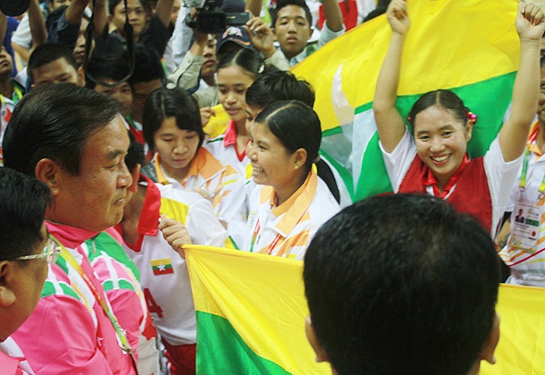 VĐV Myanmar ăn mừng chiếc HCV đầu tiên tại SEA Games.