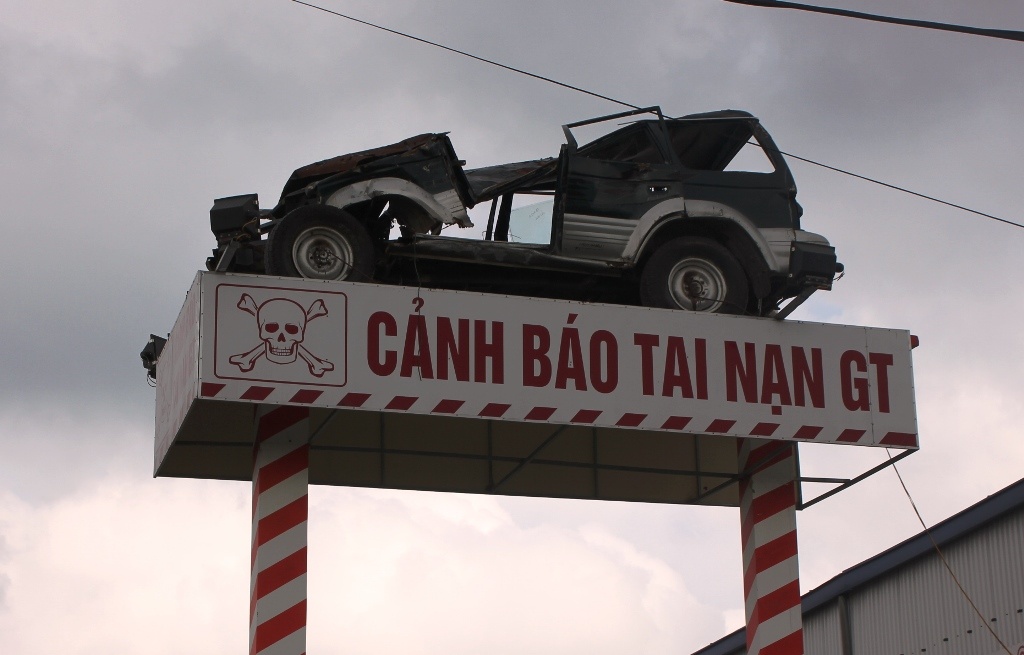 Đầu năm 2014, ông chủ doanh nghiệp đã bỏ kinh phí mua vỏ chiếc ôtô 7 chỗ bị TNGT với giá 20 triệu đồng. Sau 4 tháng xây dựng trụ đỡ bằng bê tông cốt thép, chiếc biển báo giao thông “độc nhất vô nhị” được đưa vào sử dụng.