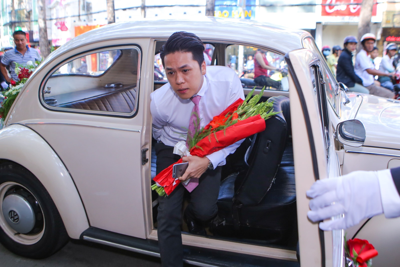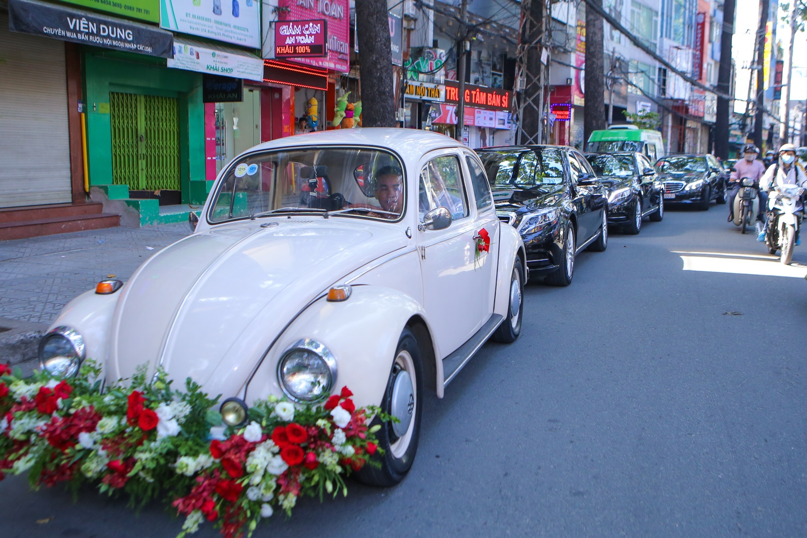| Họ nhà trai khởi hành từ chung cư cao cấp đến tư gia nhà gái tọa lạc trên đường 3/2, quận 10, TP HCM. Dẫn đầu đoàn là chiếc xế cổ mà bạn trai Diễm Hương chuẩn bị từ trước đó nhiều tháng. Xe đón dâu được sơn trắng và kết hoa đỏ - trắng lãng mạn, cũng là tông màu chủ đạo của hôn lễ. |