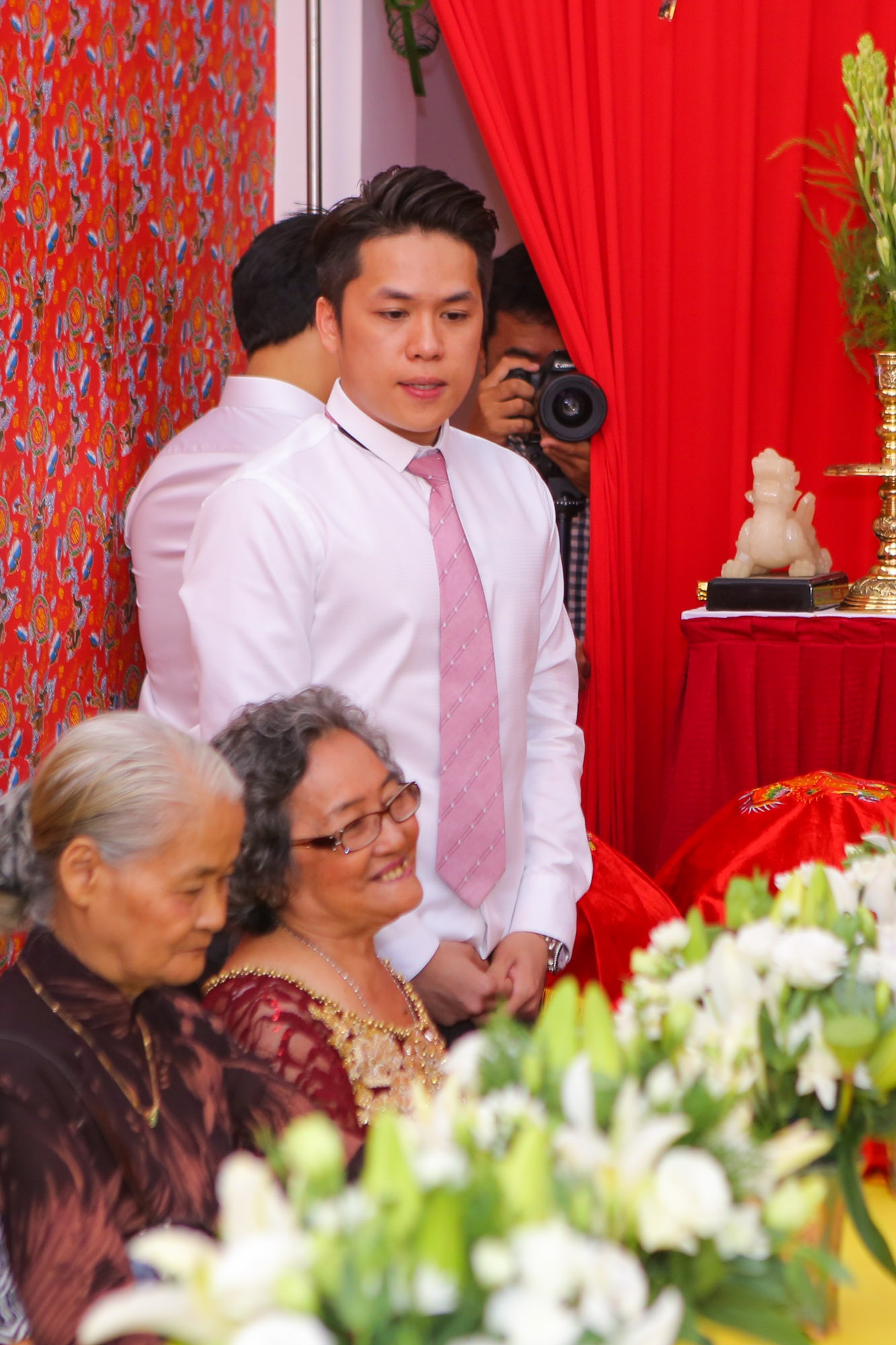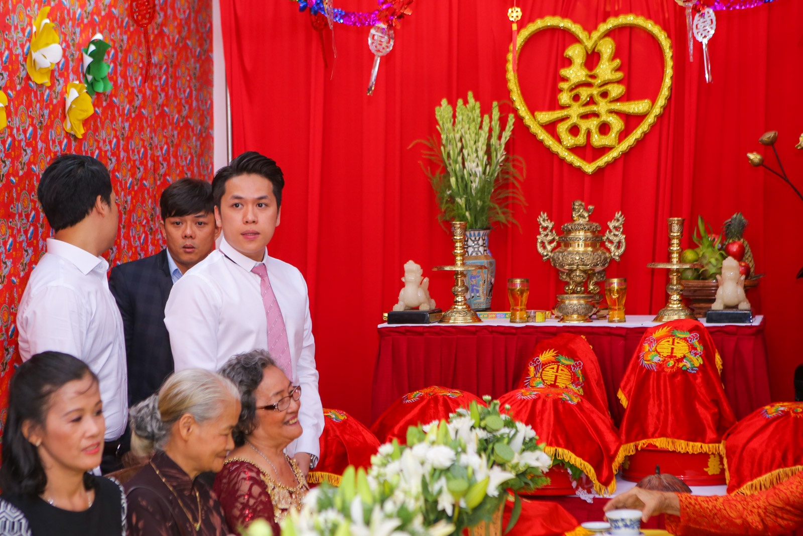 | Chồng sắp cưới của Diễm Hương hồi hộp chờ đợi khoảnh khắc cùng tân nương chào hỏi hai họ. |
