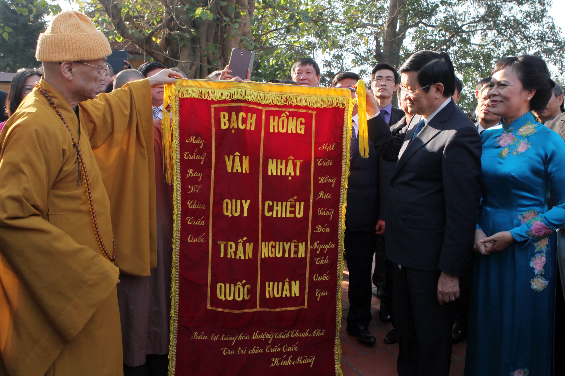 | Nhân dịp này hòa thượng Thích Thanh Nhã, trụ trì chùa tặng Chủ tịch nước câu đối 'Mây trắng bay về chùa Trấn Quốc, Mặt trời hồng rực đón nguyên thủ quốc gia'. |