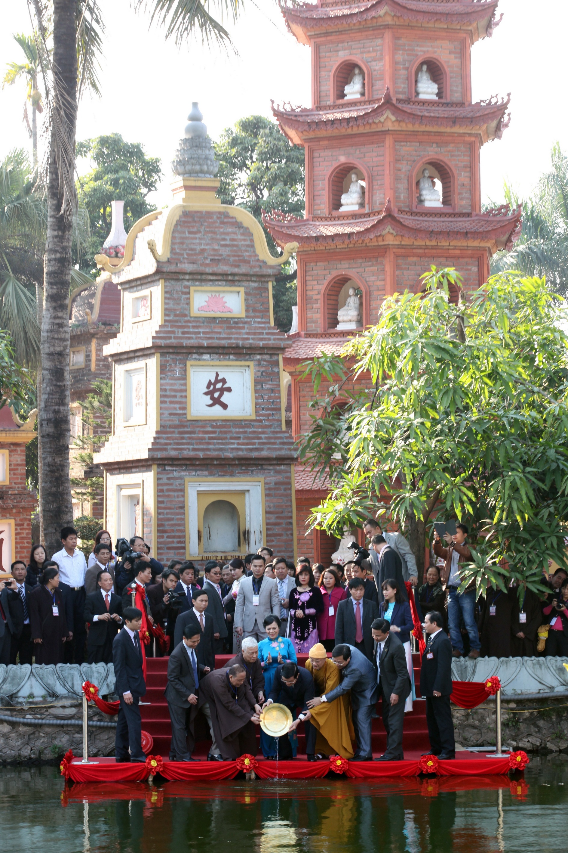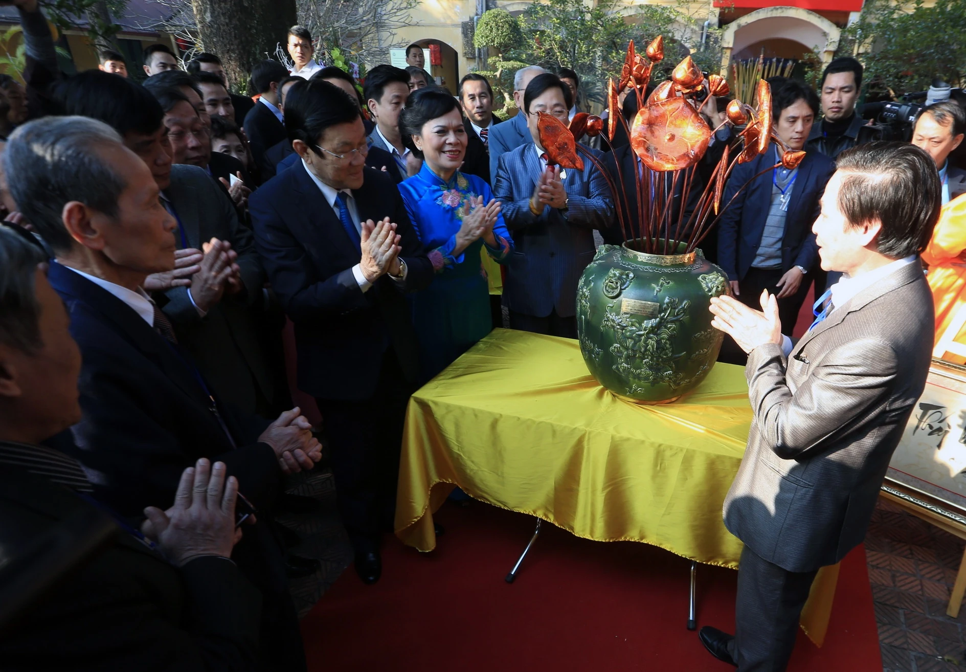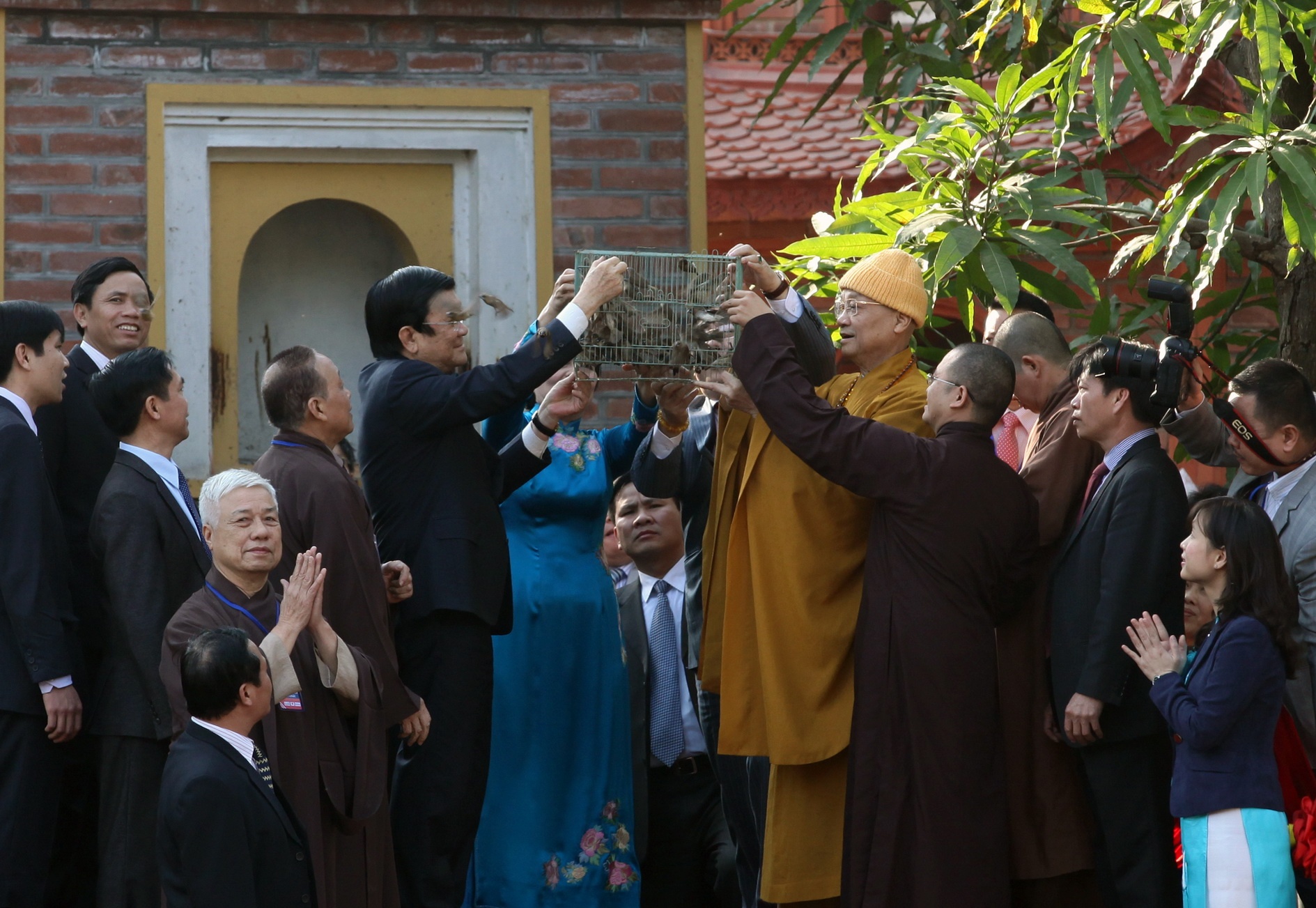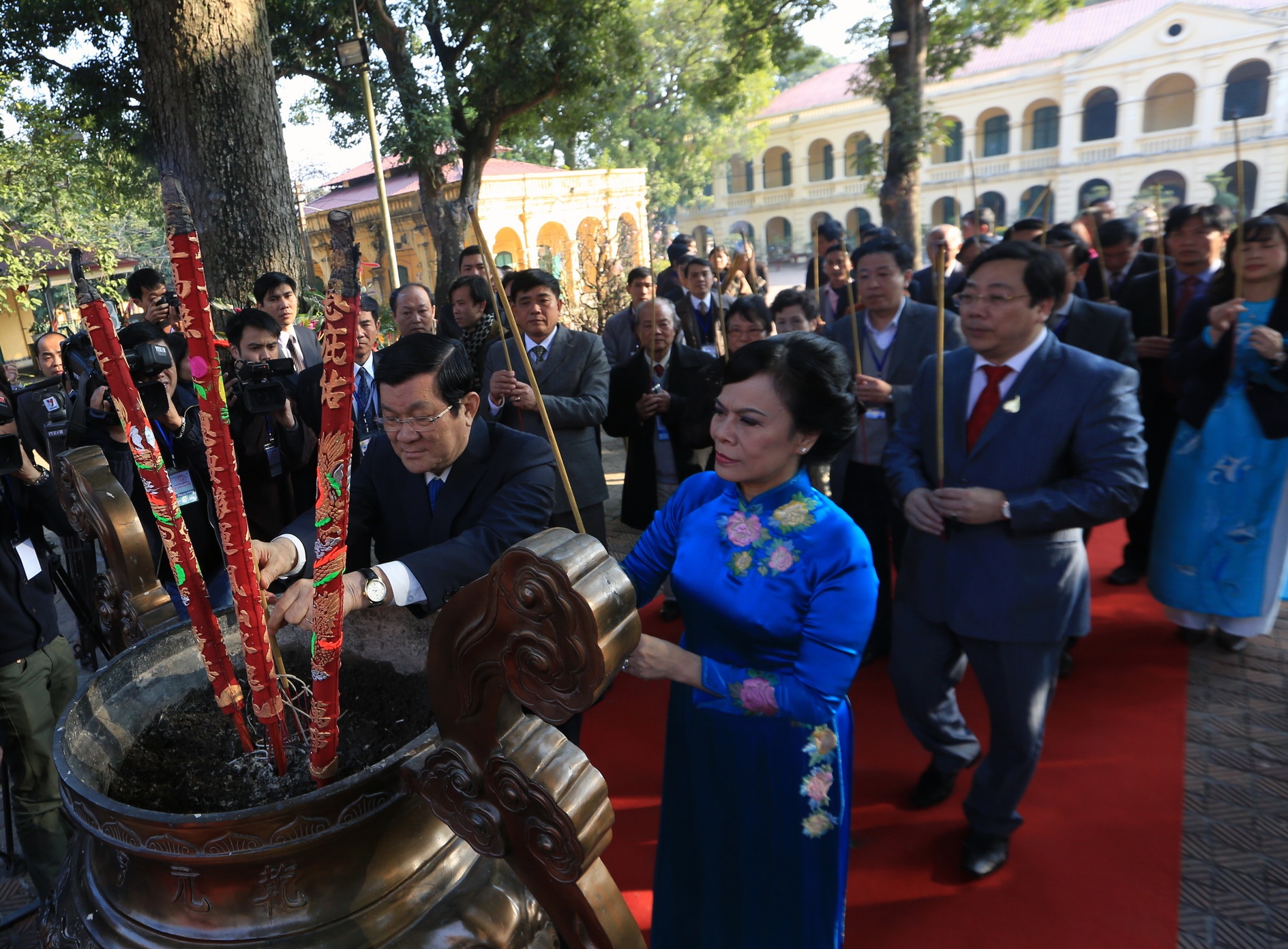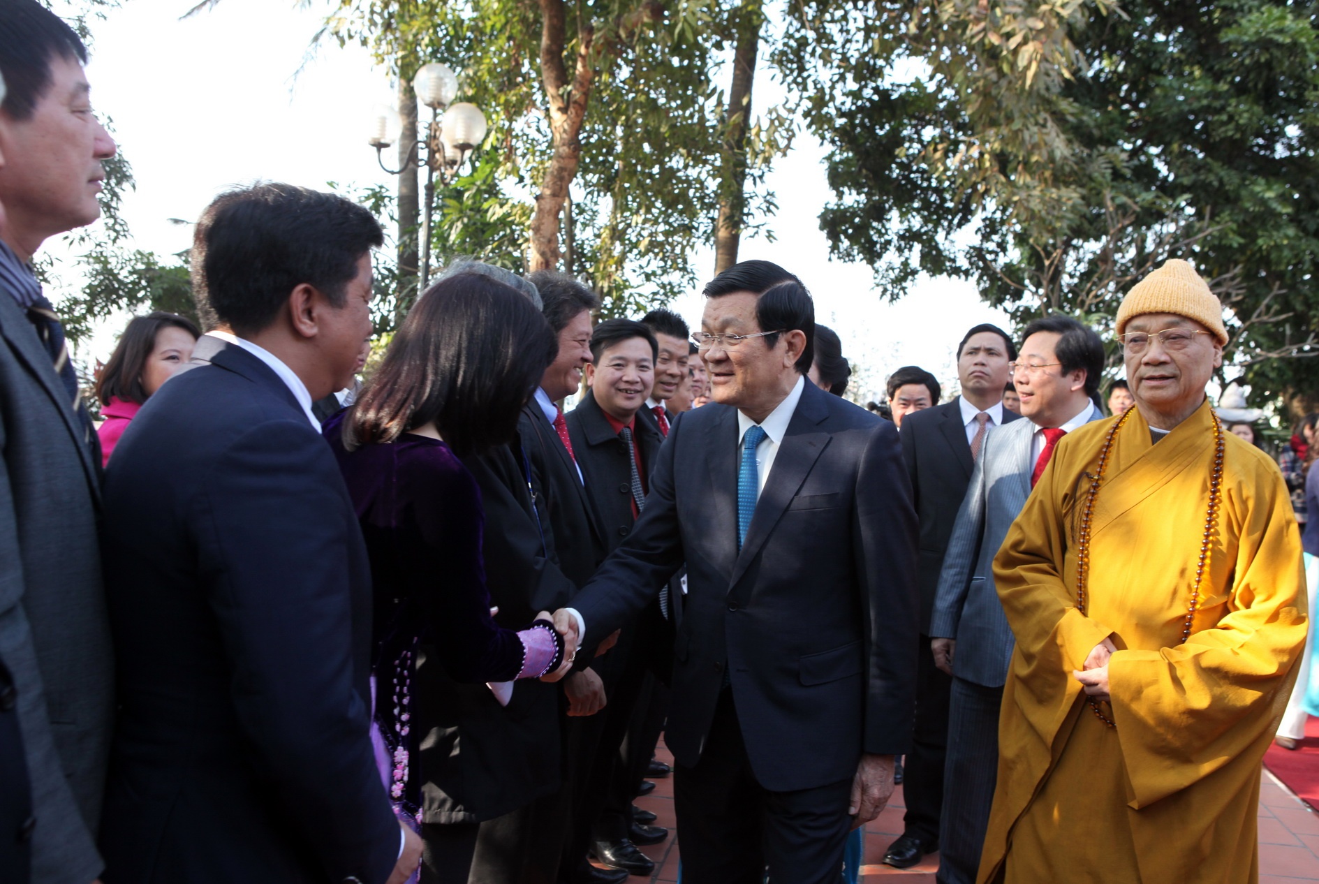 | Chủ tịch nước Trương Tấn Sang và Thứ trưởng Bộ ngoại giao - Chủ nhiệm Ủy ban Nhà nước về người Việt Nam ở nước ngoài Nguyễn Thanh Sơn cùng đại diện kiều bào tới thăm chùa Trấn Quốc lúc 15h15 chiều 23/1. |