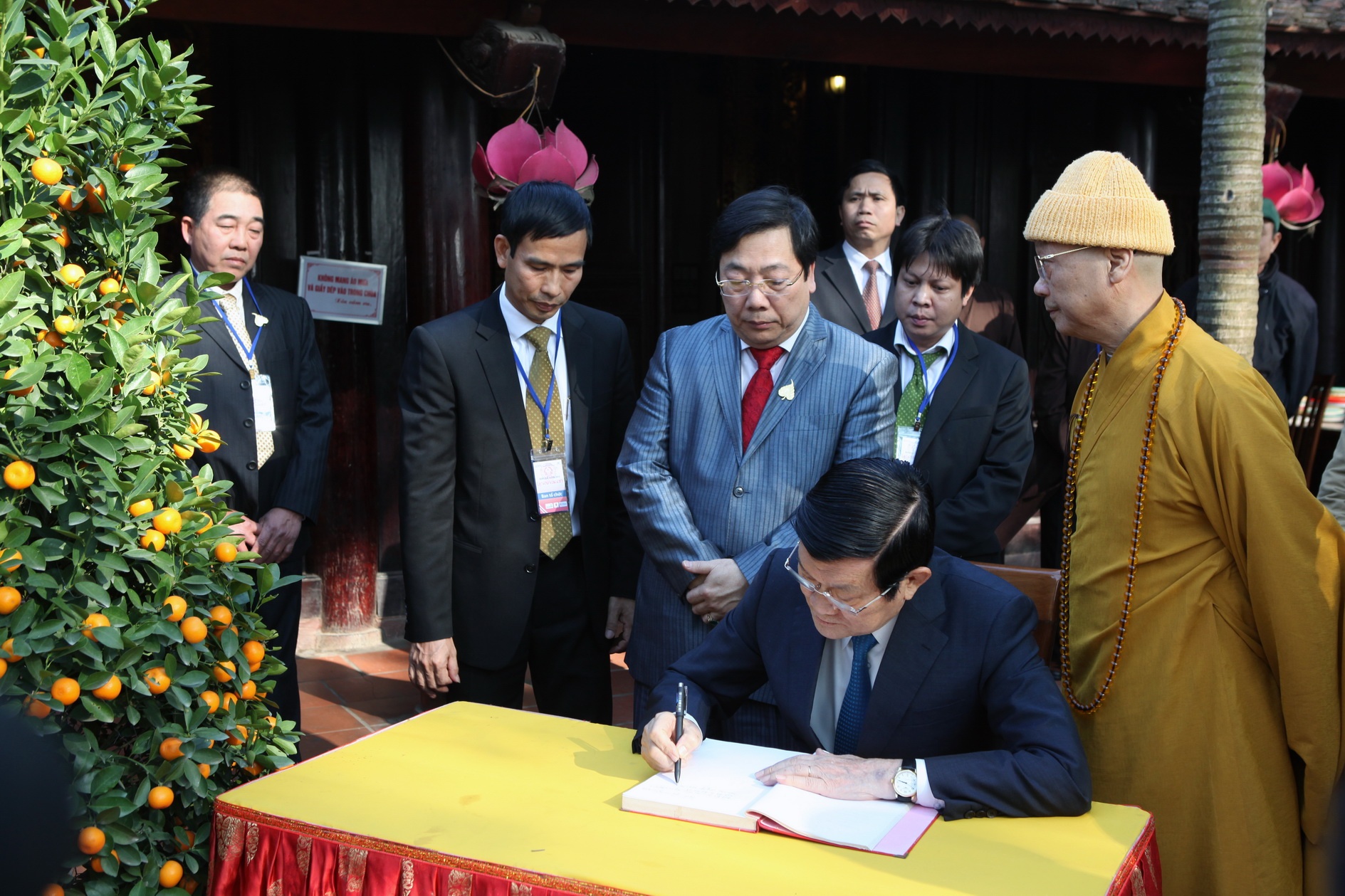 | Chủ tịch nước ghi cảm tưởng lên cuốn lưu bút tại chùa sau khi đi tham quan một vòng. |