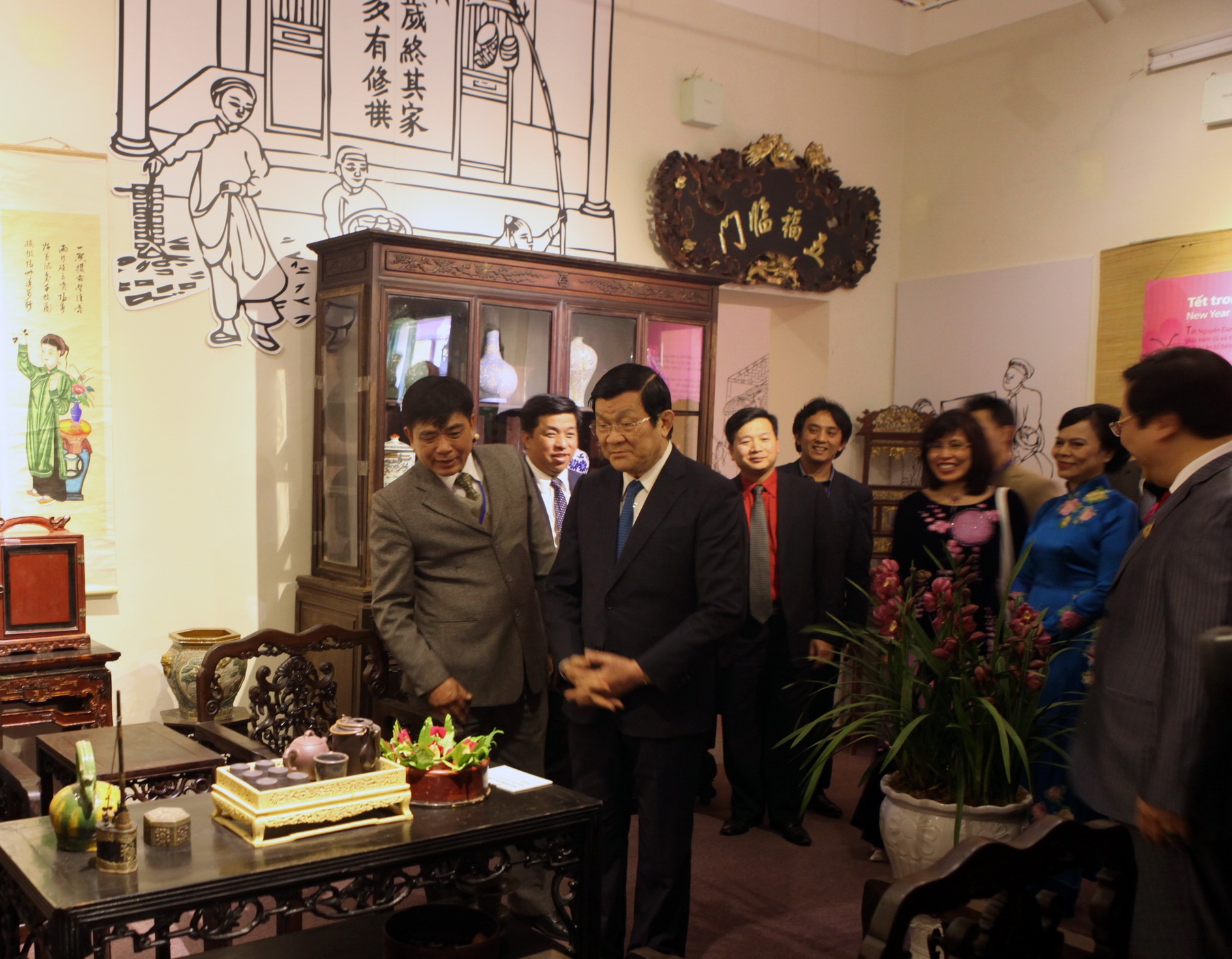 | Cuối cùng, Chủ tịch nước cùng phái đoàn vào thăm gian phòng tái hiện không gian văn hóa Việt bên trong Hoàng thành Thăng Long. |
