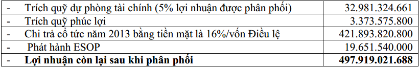 Kế hoạch kinh doanh năm 2014 được đặt ra cẩn trọng với doanh thu thuần 2.654 tỷ đồng, tăng hơn 250 tỷ đồng so với mức thực hiện năm 2013 và LNST 892 tỷ đồng, giảm 8,6%. Cổ tức dự kiến năm 2014 sẽ do Hội đồng Quản trị (HĐQT) quyết định, nhưng không thấp hơn 12%. Kế hoạch phân phối lợi nhuận năm 2013 được đề xuất như sau: