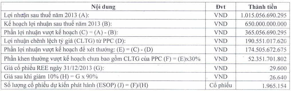 Theo tính toán, một khoản thưởng đã được hạch toán vào chi phí trong báo cáo tài chính năm 2013 là 52,35 tỷ đồng - không bao gồm lợi nhuận từ chênh lệch tỷ giá của PPC. Bảng tính toán chi tiết của REE như sau: