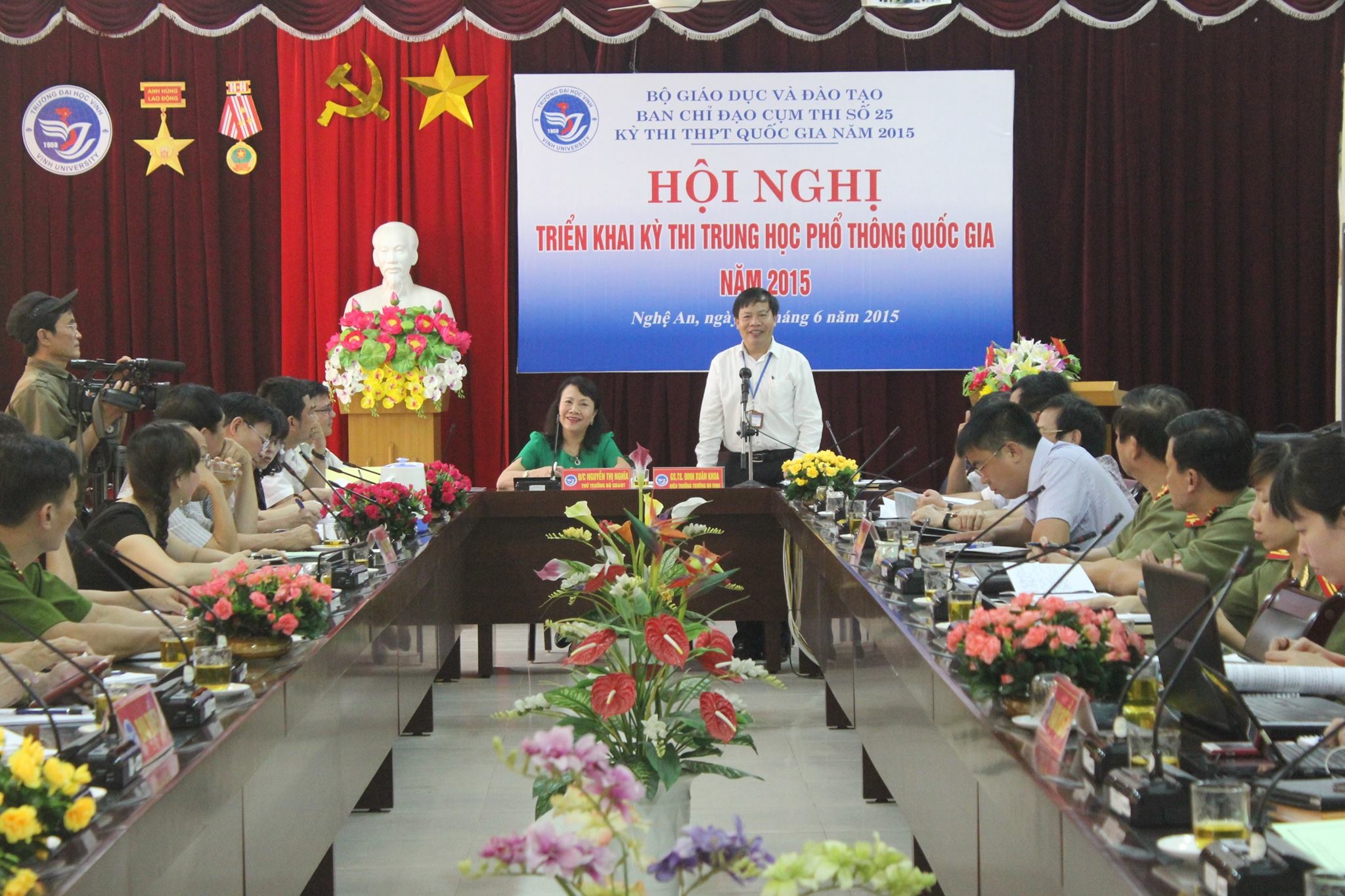 Mở đầu, tiến sĩ Đinh Xuân Khoa, Hiệu trưởng Đại học Vinh, Chủ tịch Hội đồng Cụm thi số 25, báo cáo công tác chuẩn bị cho kỳ thi THPT quốc gia 2015.