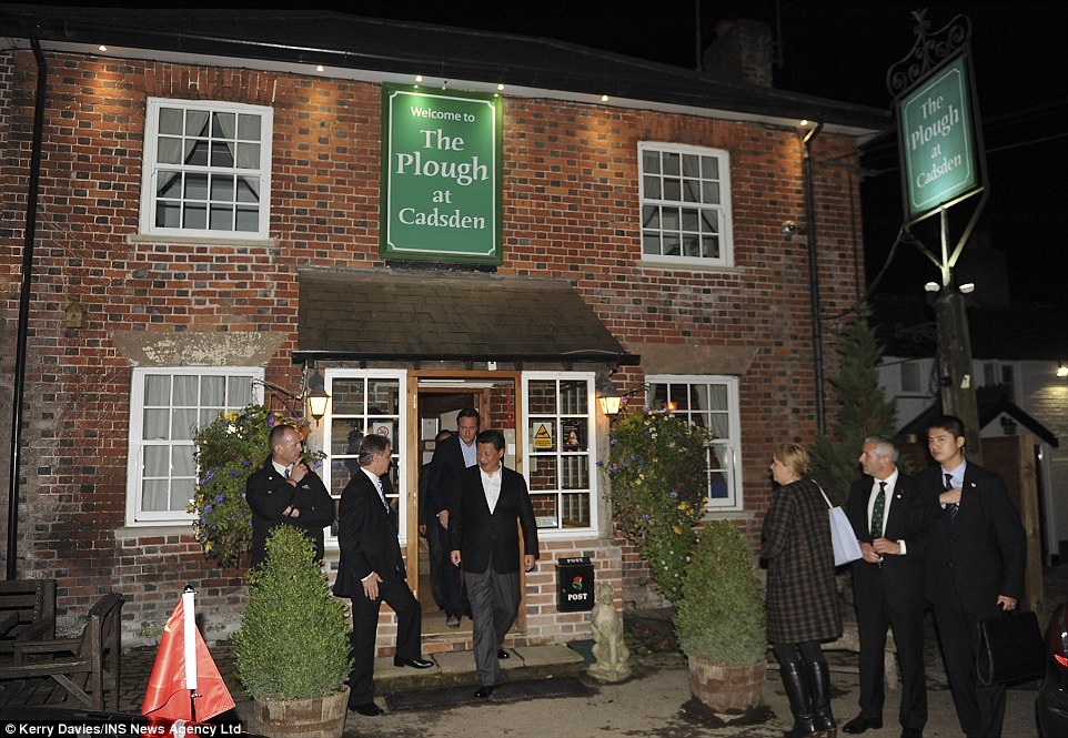Chủ tịch Tập Cận Bình (đi trước) và Thủ tướng Cameron rời khỏi quán nhậu được xây dựng từ thế kỷ 16. Ảnh: INS News