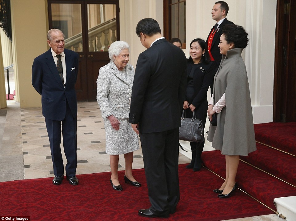 Cùng ngày, Chủ tịch Tập và phu nhân Bành Lệ Viện cảm ơn Nữ hoàng Anh và Quận công Philip vì đã đón tiếp và mở quốc yến chiêu đãi họ tại cung điện Buckingham. Ảnh: Getty