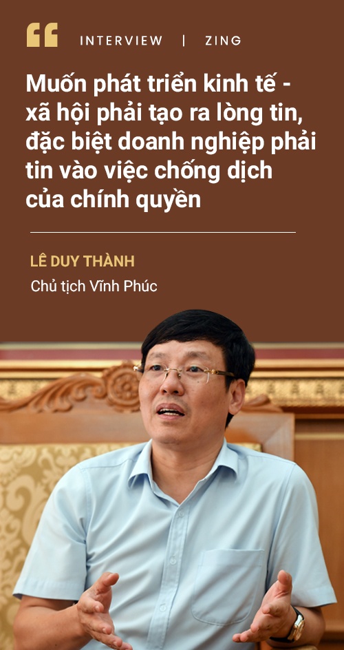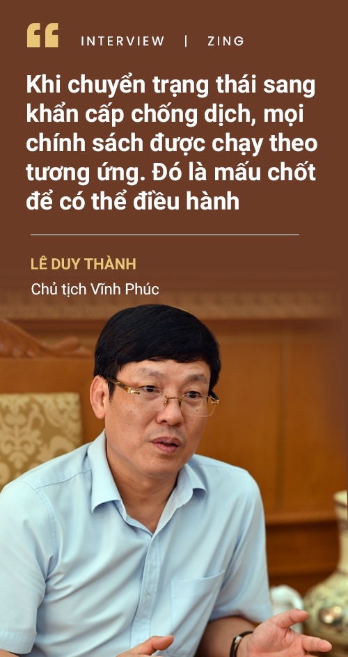Trong cuộc phỏng vấn với Zing, Chủ tịch UBND tỉnh Vĩnh Phúc Lê Duy Thành hồ hởi kể lại những ngày chống dịch khó khăn, quyết liệt trước kia. Vĩnh Phúc là tỉnh đầu tiên xuất hiện ca nhiễm Covid-19 ở Việt Nam, cũng là tỉnh trải qua hầu hết đợt dịch đều có ca nhiễm. Khi đó, lãnh đạo tỉnh hiểu hơn hết mỗi quyết định trong gang tấc đều mang ý nghĩa quan trọng, ảnh hưởng đến hàng triệu người dân.