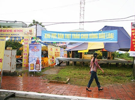 | Ngay cổng ra vào, đập vào mắt khách tham quan là tấm biển mời mua thịt lớn: Nơi bán thịt trâu vòng đấu loại. |