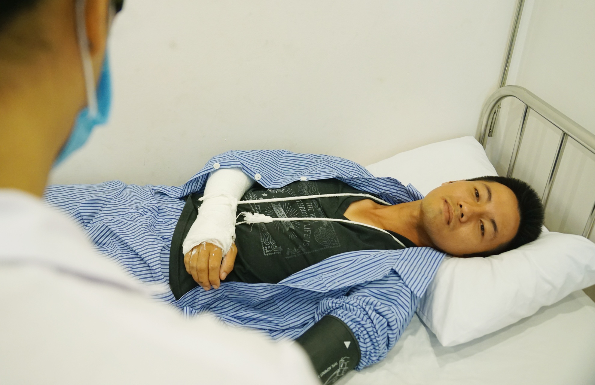 | Thượng úy Phạm Quốc Long đang điều trị tại bệnh viện Công an TP Hà Nội. Ảnh: Phạm Duy. |