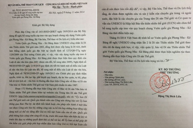 Công văn do Thứ trưởng Bộ VH-TT&DL Đặng Thị Bích Liên ký, có nêu rõ: Vườn quốc gia Phong Nha - Kẻ Bàng được UNESCO công nhận là di sản thiên nhiên thế giới năm 2003, đồng thời được xếp hạng là di tích, danh lam thắng cảnh quốc gia đặc biệt theo quyết định của Thủ tướng Chính phủ năm 2009.