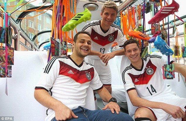 | Hôm qua, bộ cánh mới của tuyển Đức do Adidas thiết kết đã được Oezil, Mueller và một số cầu thủ ra mắt người hâm mộ tại Munich. |