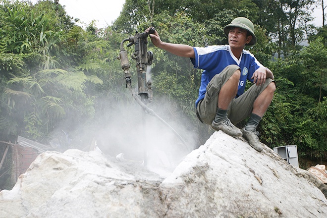 Trưa nay, thợ khoan đá dùng máy trợ lực phá bỏ tảng đá lớn.