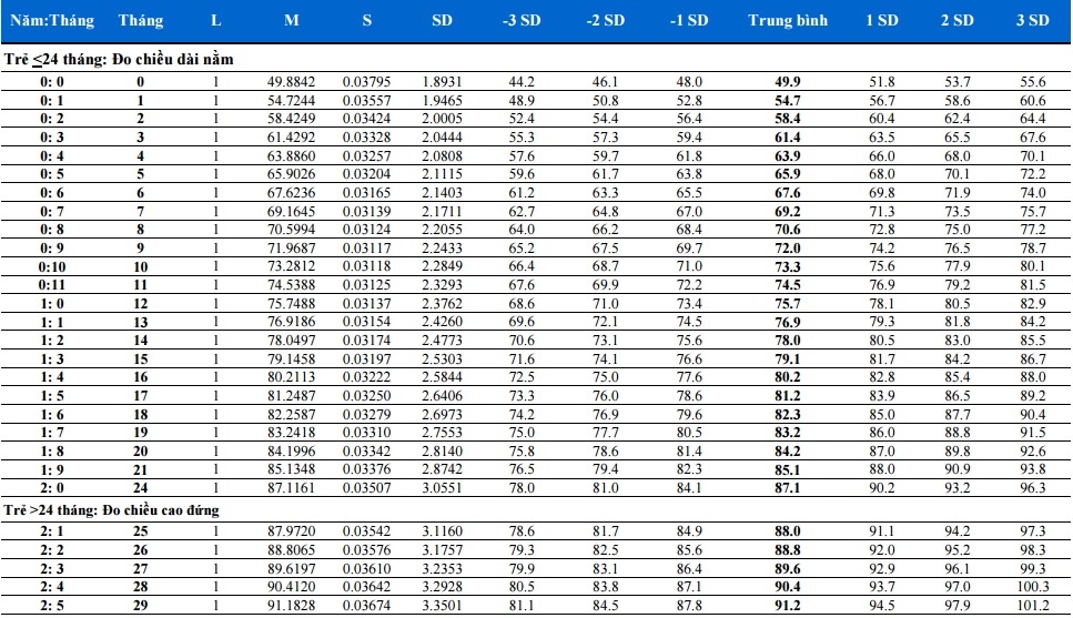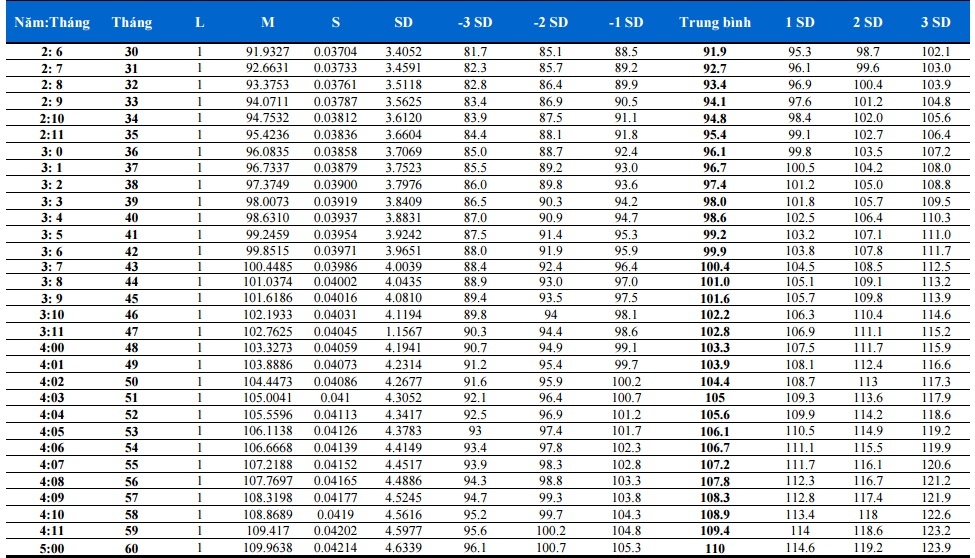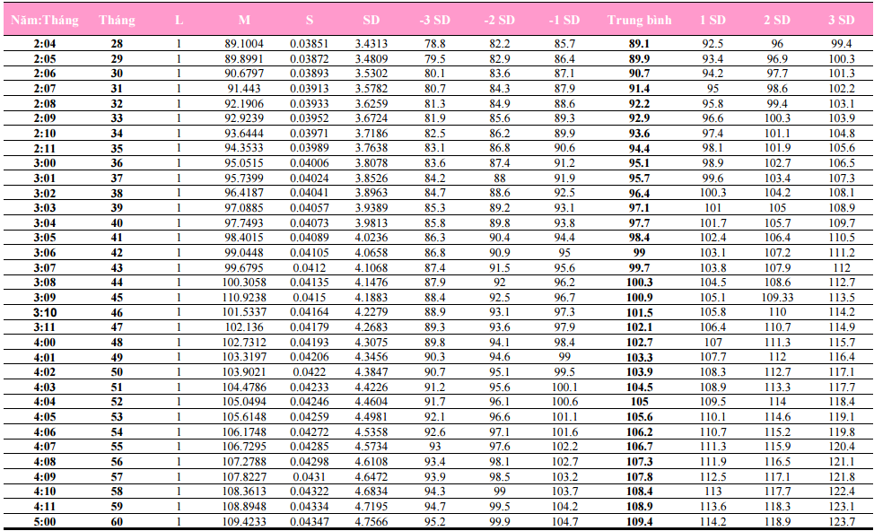 Theo bảng này, tương ứng với mỗi tháng tuổi là chỉ số về chiều cao (theo cm), bảng dành cho bé trai và bé gái khác nhau.