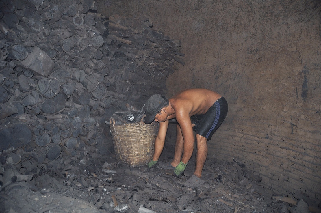 Sau 2 tháng nung gỗ ở nhiệt độ cao, những người thợ than mở cửa hầm lò thu hoạch sản phẩm. Họ phải chịu đựng cái nóng 60 độ C, không khí ngột ngạt để đưa than ra ngoài.
