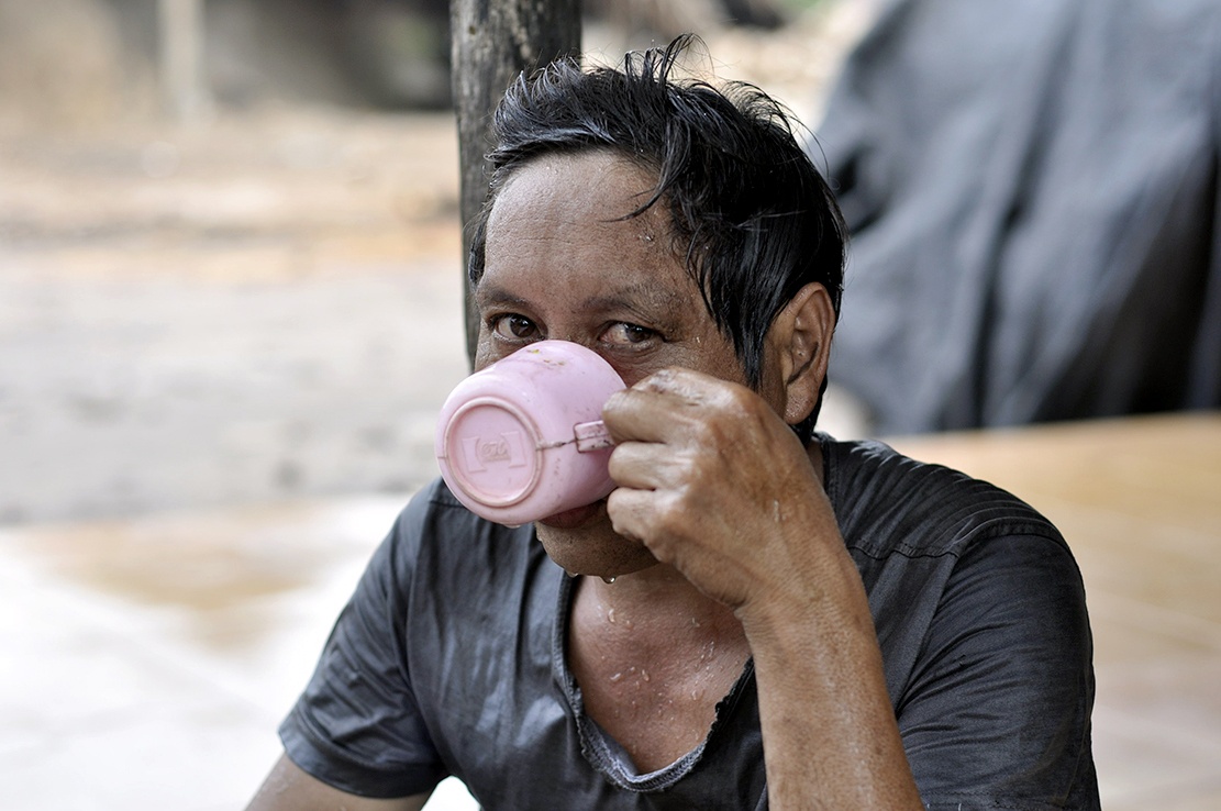 Một thợ than tranh thủ uống nước trước khi trở lại công việc. Người này cho biết, trong lò nóng khiến cơ thể liên tục toát mồ hôi nên anh rất khát nước.