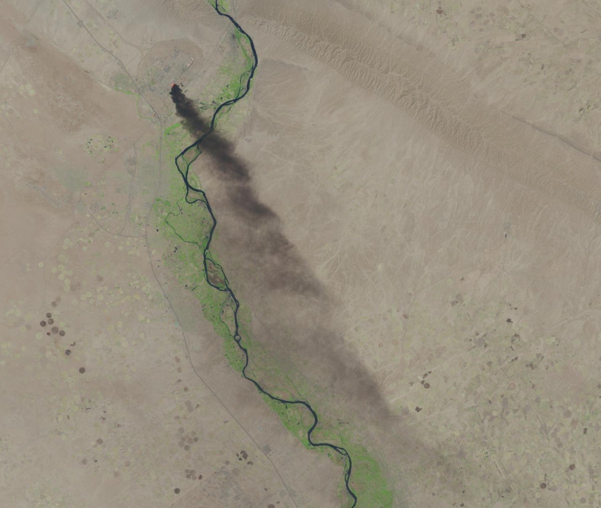 | Chùm đen khói kéo dài phát ra từ nhà máy lọc dầu lớn nhất Iraq vào ngày 18/6/2014 sau khi phiến quân tấn công các nhà máy lọc dầu. |