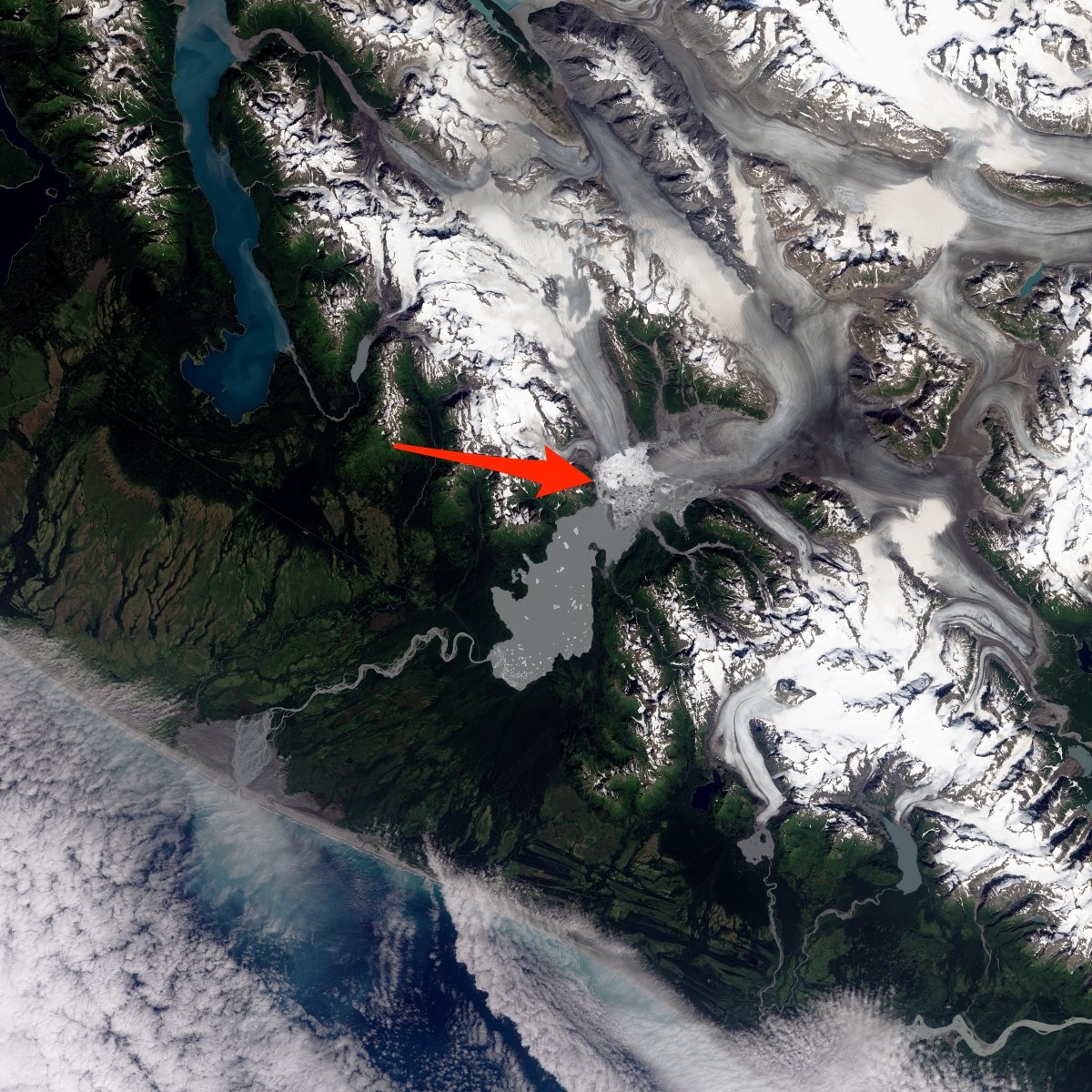 | Harlequin, tên của hồ nước bên cạnh sông băng Yakutat, Mỹ, vào ngày 13/8/2013. Các nhà khoa học nhận định Yakutat là một trong những sông băng tan nhanh nhất của thế giới. Mũi tên đỏ chỉ vào các tảng băng trôi đang hình thành. |