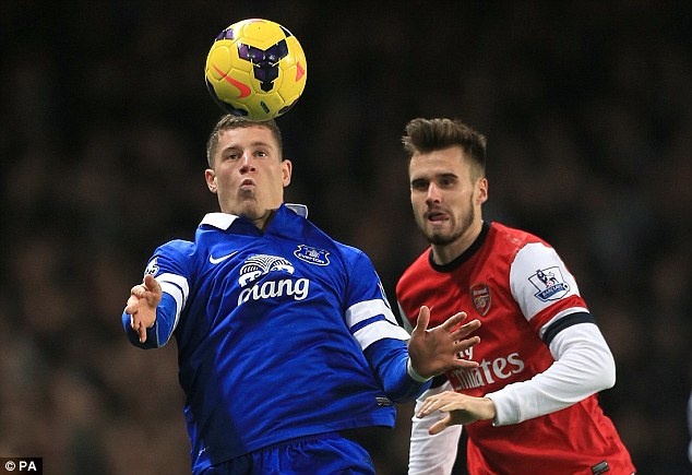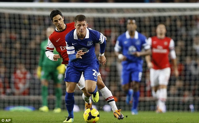 | Ross Barkley tranh bóng với Mikel Arteta. Ở trận gặp Arsenal, tiền vệ người Anh hoàn thành tốt nhiệm vụ giữ nhịp trận đấu cho Everton. |