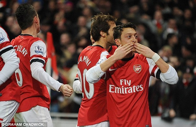 | Niềm vui của cầu thủ Arsenal sau khi Mesut Oezil ghi bàn vượt lên dẫn trước. |