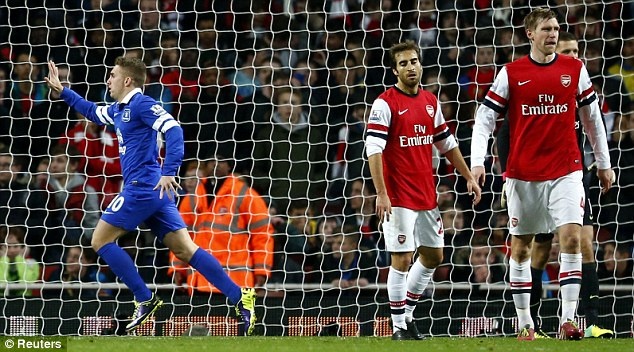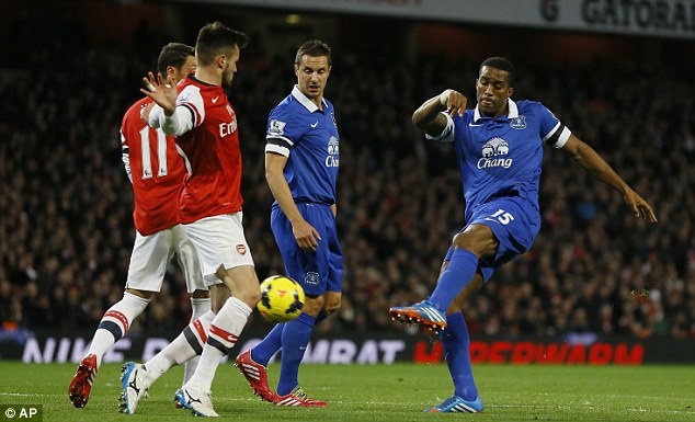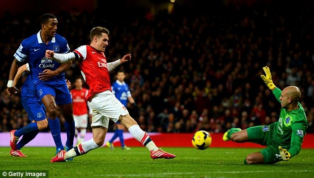 | Tiền vệ Ramsey cũng không thể đánh bại thủ môn Everton trong tình huống đối mặt. |