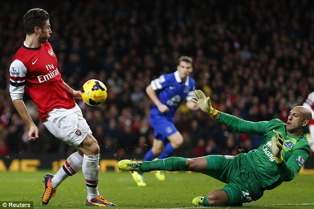 | Tim Howard xuất sắc cản phá cú dứt điểm của Giroud. |