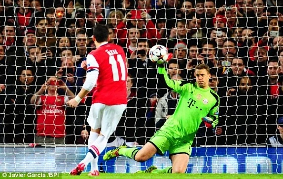 | Trên chấm 11m, tiền vệ khoác áo số 11 của Arsenal không đánh bại được thủ môn Neuer. Đây là lần thứ 2 Mesut Oezil thực hiện penalty không thành công ở Champions League mùa này. |