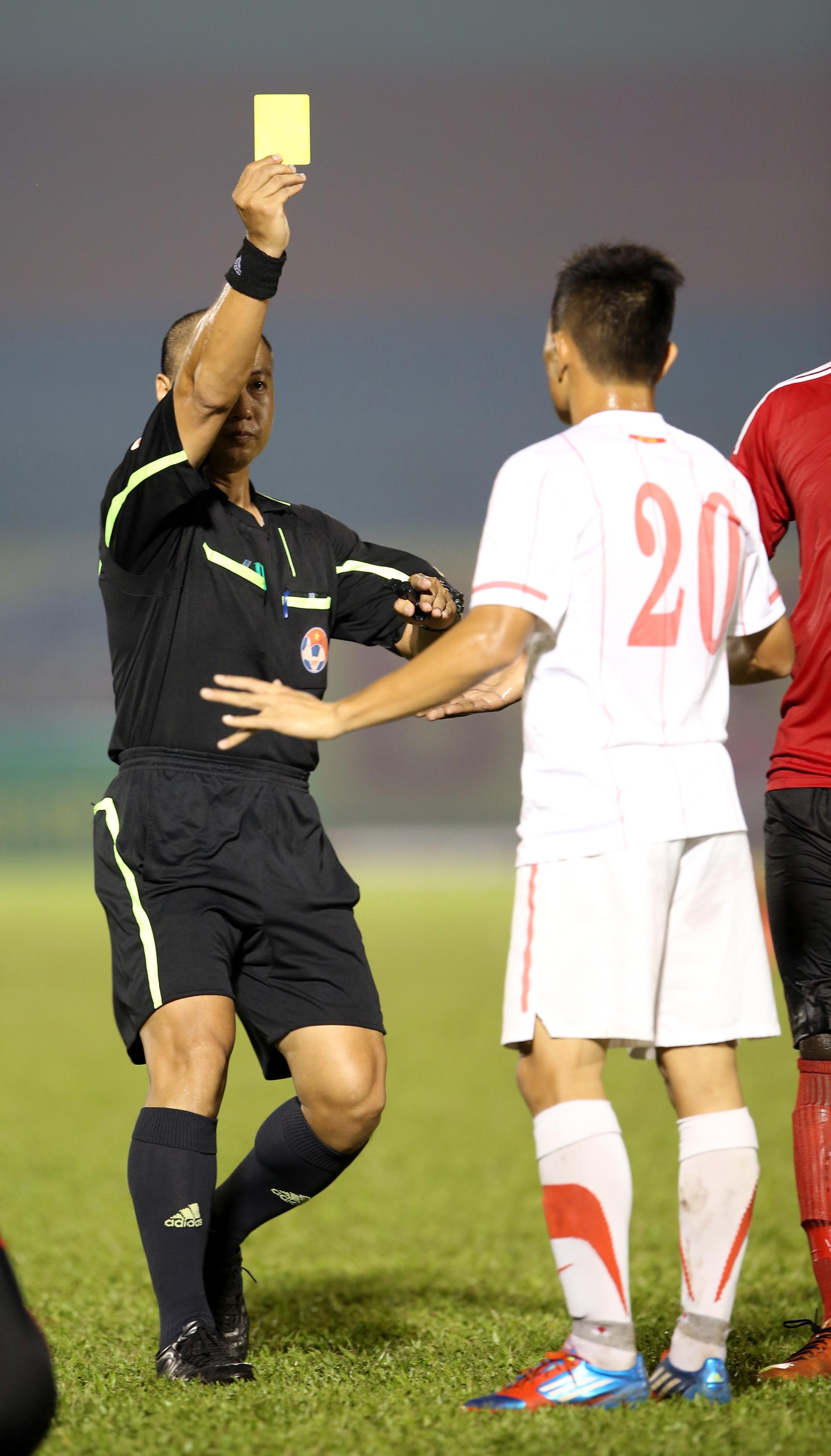 | Trong một số thời điểm, U23 Việt Nam chơi rất rắn khiến trọng tài Hoàng Anh Tuấn phải rút thẻ. |