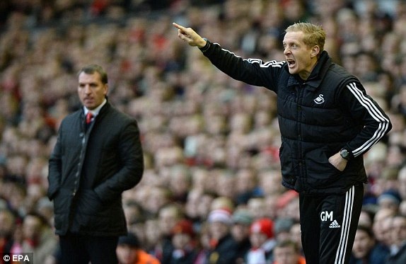 HLV Garry Monk của Swansea tích cực chỉ đạo học trò sau khi đội nhà gỡ hòa 3-3.