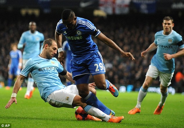 | Samuel Eto'o ra sân ngay từ đầu, nhưng tiền đạo khoác áo số 29 của Chelsea không có nhiều khoảng trống khi nhận được sự chăm sóc đặc biệt của Zabaleta. |