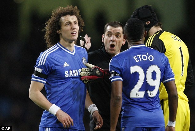 | Hậu vệ David Luiz phải nhận thẻ vàng từ trọng tài Phil Dowd sau một tình huống vào bóng nguy hiểm với đối phương. |