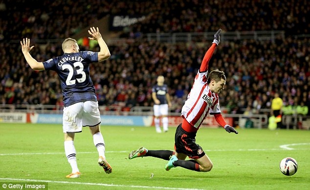 | Cleverley phạm lỗi với Adam Johnson trong vòng 16m50. |