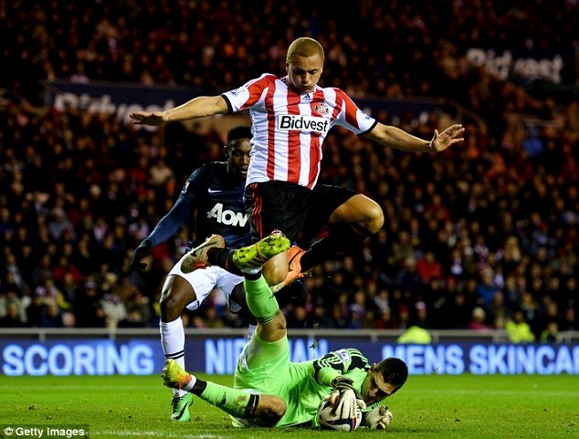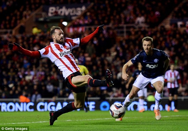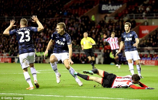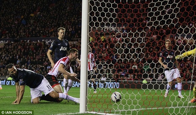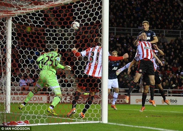 | Bàn thắng dẫn trước MU khiến các cầu thủ Sunderland phấn khích. |