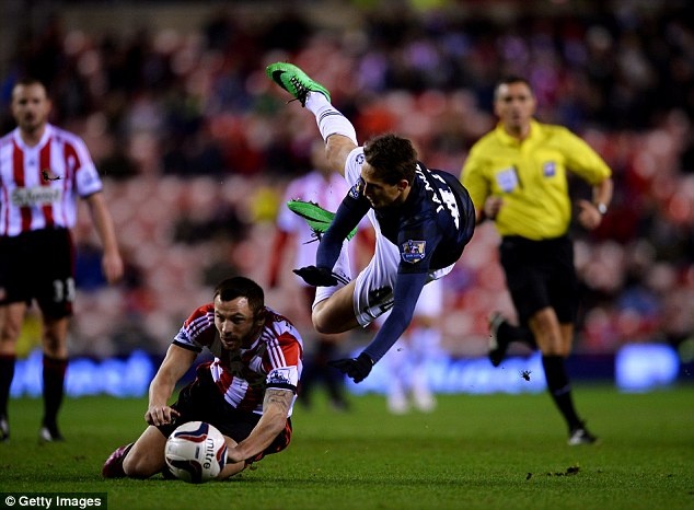 | Bardsley may mắn không phải nhận thẻ vàng sau pha vào bóng nguy hiểm đối với Januzaj. |