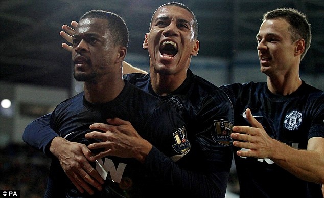| Trước khi hiệp 1 khép lại, Evra đánh đầu nâng tỷ số lên 2-1 cho đội khách. |