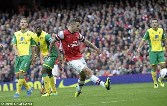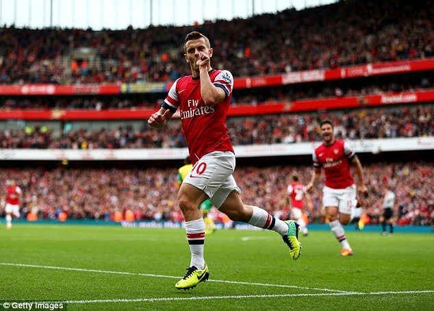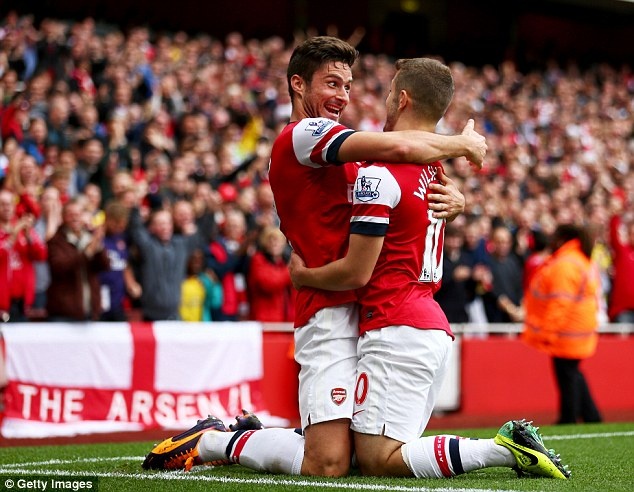 | Niềm vui của Giroud và Wilshere sau khi có pha phối hợp đưa Arsenal vượt lên dẫn trước Norwich. |