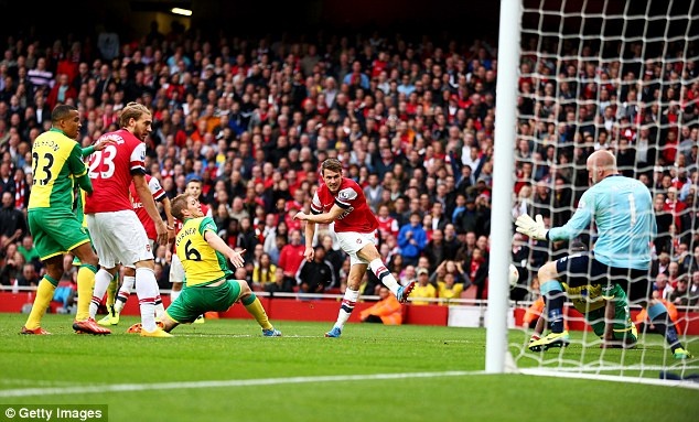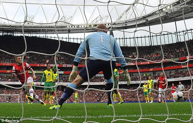 | Nhận đường chuyền của Giroud, tiền vệ Wilshere dứt điểm kỹ thuật mở tỷ số cho Arsenal ở phút 18. |