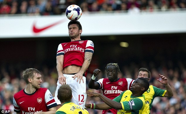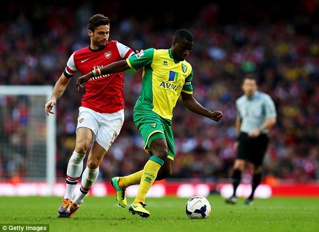 | Cầu thủ Norwich tập trung khóa ngòi nổ Giroud bên phía đội chủ sân Emirates. |