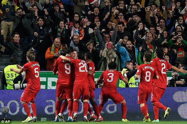 | Cầu thủ Bồ Đào Nha vui mừng sau khi CR7 có pha ghi bàn đẳng cấp vào lưới ĐT Thụy Điển. |