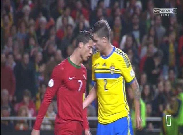 | CR7 có pha không chiến với Sebastian Larsson. |