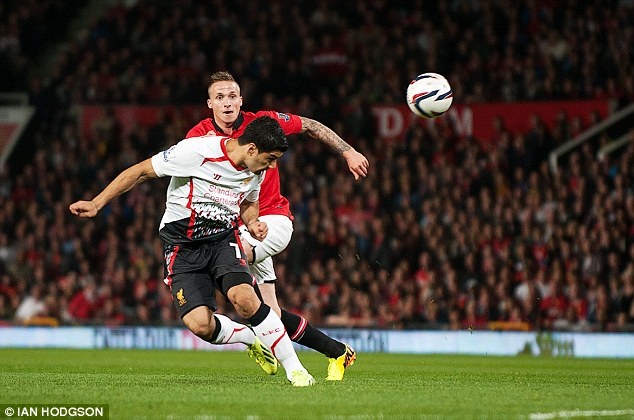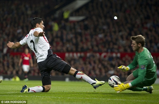 | Luis Suarez có cơ hội ghi bàn sau khi Jonny Evans đánh đầu phá bóng trượt, nhưng chân sút người Uruguay lại khống chế bóng quá dài và để cho thủ môn De Gea có pha cản phá thành công. |