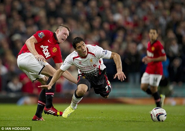 | Chân sút khoác áo số 7 của Liverpool ngã trong pha tranh bóng với Phil Jones. |