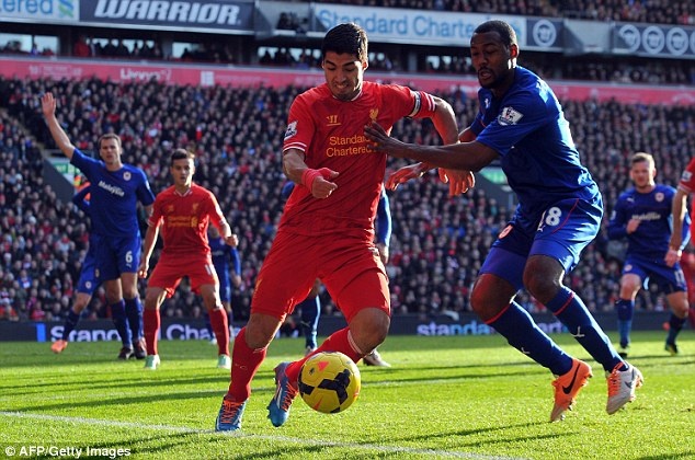| Luis Suarez lần thứ 2 xuyên thủng mành lưới Cardiff, nâng tổng số bàn thắng ở Ngoại hạng Anh mùa này lên con số 19. |
