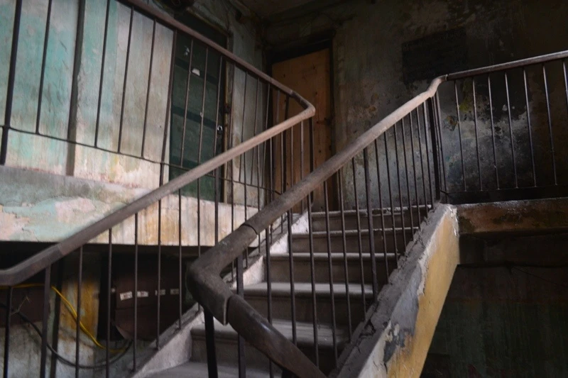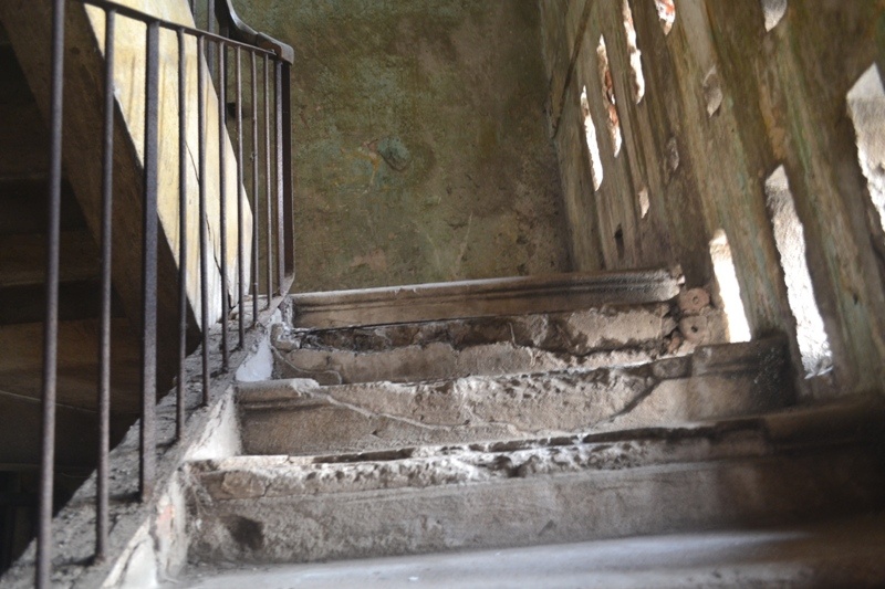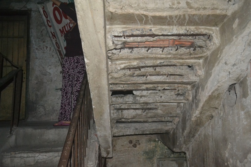 | Phía trong, lan can cầu thang xập xệ, bậc và nền cầu thang đều đã hư hỏng nặng, nhiều mảng tường vôi bị bong tróc khiến nước thấm vào trong gây ẩm mốc. |
