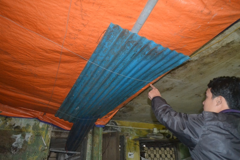 | Trần nhà tầng 5 đã bị thấm nước nghiêm trọng, người dân phải căng bạt để hứng nước mưa. |