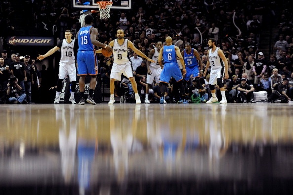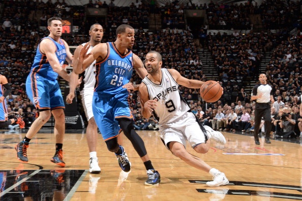| Trong khi do Serge Ibaka vắng mặt vì chấn thương bắp chân, sự thay thế Nick Collison (áo xanh) lại trở thành điểm yếu nơi hệ thống phòng ngự của Oklahoma City Thunder. Anh tỏ ra quá chậm chạp trong việc theo kèm những ngôi sao có tốc độ tốt của Spurs như Tony Parker hay Kawhi Leonard. |