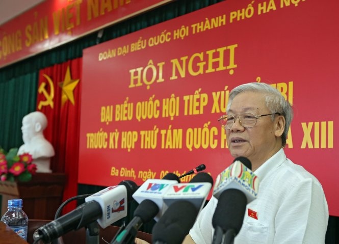 | Tổng bí thư Nguyễn Phú Trọng tiếp xúc với cử tri quận Ba Đình (Hà Nội). |